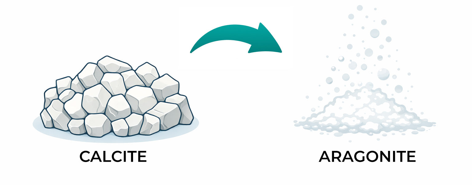 Calcite e aragonite rappresentano due differenti forme cristalline del carbonato di calcio: la calcite possiede una struttura cristallina trigonale o romboedrica, termodinamicamente stabile, mentre l’aragonite ha una struttura rombica o prismatica, meno stabile. Quest’ultima può persistere per un periodo di circa 2–3 giorni, in funzione delle caratteristiche dell’acqua, dopodiché tende a trasformarsi nella forma più stabile, ossia la calcite.